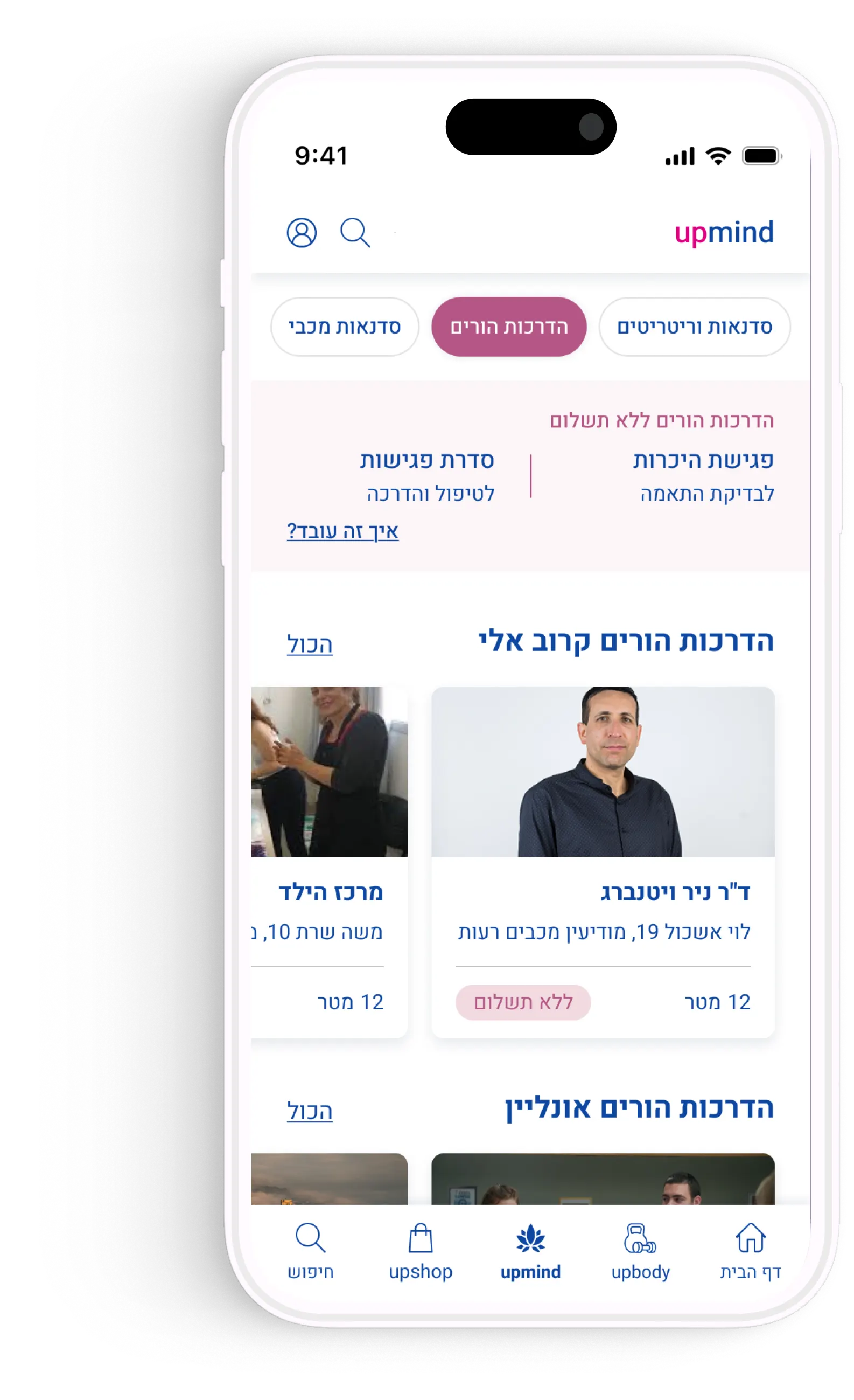 upmind הוא עולם חדש ב-upapp שמוקדש כולו לנפש: מגוון סדנאות וריטריטים ב40% הנחה ובמימוש 400 uppers, לחברי מכבי שלי ומכבי זהב. הדרכת הורים ללא תשלום - להורים לילדים מגיל 3 עד 18. השירותים בupmind מתאימים לגיל 18 ומעלה